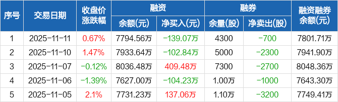 融资方面,当日融资买入709.44万元,融资偿还848.51万元,融资净偿还139.07万元。融券方面,融券卖出0股,融券偿还700股,融券余量4300股,融券余额7.15万元。融资融券余额合计7801.71万元。
