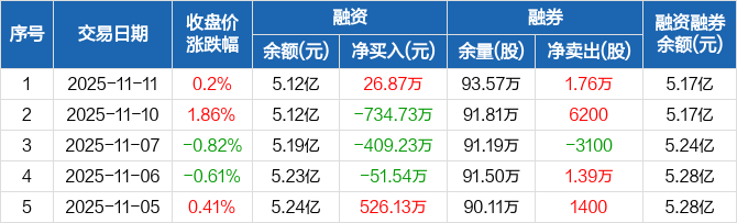 融资方面,当日融资买入1725.9万元,融资偿还1699.04万元,融资净买入26.87万元。融券方面,融券卖出2.19万股,融券偿还4300股,融券余量93.57万股,融券余额463.17万元。融资融券余额合计5.17亿元。