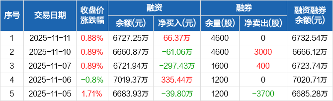 融资方面,当日融资买入506.81万元,融资偿还440.44万元,融资净买入66.37万元。融券方面,融券卖出0股,融券偿还0股,融券余量4600股,融券余额5.29万元。融资融券余额合计6732.54万元。