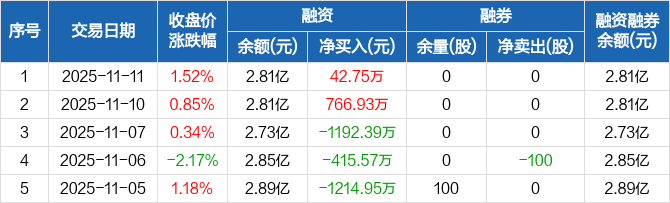 融资方面,当日融资买入2454.3万元,融资偿还2411.55万元,融资净买入42.75万元。融券方面,融券卖出0股,融券偿还0股,融券余量0股,融券余额0元。融资融券余额合计2.81亿元。