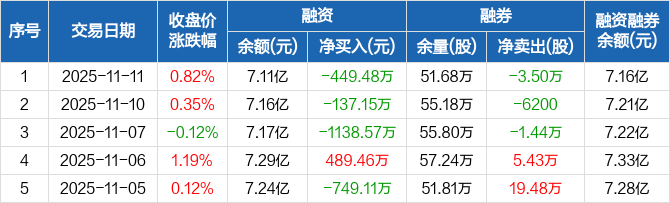 中铁工业融资融券信息显示,2025年11月11日融资净偿还449.48万元;融资余额7.11亿元,较前一日下降0.63%。