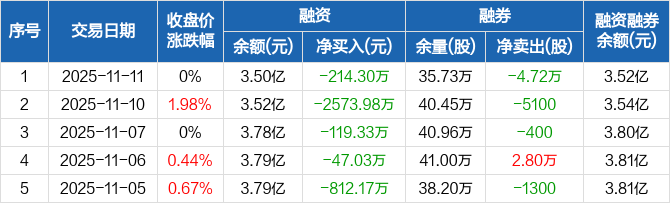 岳阳林纸融资融券信息显示,2025年11月11日融资净偿还214.3万元;融资余额3.5亿元,创近一年新低,较前一日下降0.61%。