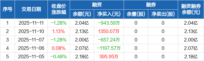 融资方面,当日融资买入1047.39万元,融资偿还1990.98万元,融资净偿还943.59万元。融券方面,融券卖出0股,融券偿还0股,融券余量0股,融券余额0元。融资融券余额合计2.04亿元。