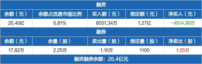 融资方面,当日融资买入8051.34万元,融资偿还1.27亿元,融资净偿还4614.96万元。融券方面,融券卖出1.16万股,融券偿还1100股,融券余量2.25万股,融券余额17.82万元。融资融券余额合计26.4亿元。