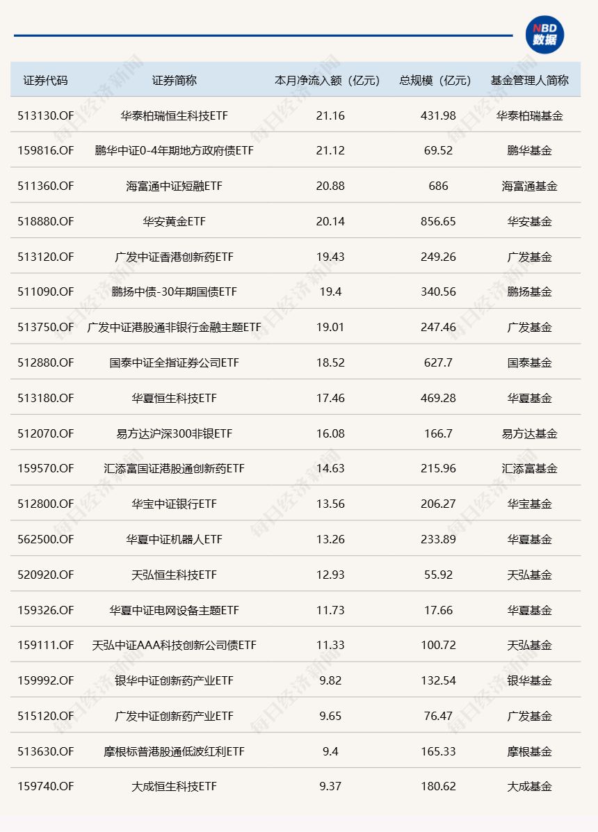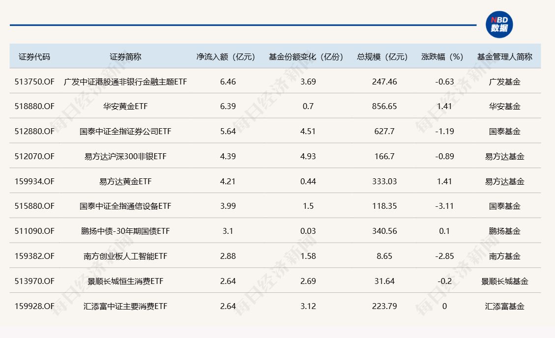 ETF规模速报 | 港股通非银ETF、黄金ETF昨日净流入额均超6亿元