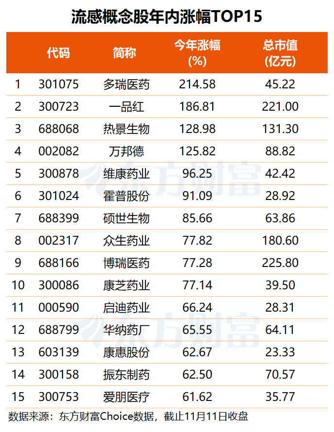 东方财富概念板块显示,目前A股市场共有119只流感概念股,合计总市值达1.57万亿元,超八成流感概念股年内股价上涨,其中,多瑞医药、一品红、热景生物、万邦德股价翻倍;众生药业、博瑞医药、华纳药厂等十余股区间涨幅超50%。