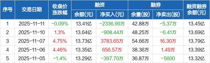 融资方面,当日融资买入3133.98万元,融资偿还5470.97万元,融资净偿还2336.99万元。融券方面,融券卖出3800股,融券偿还5.75万股,融券余量42.88万股,融券余额468.68万元。融资融券余额合计13.45亿元。