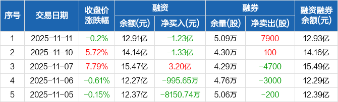 恩捷股份融资融券信息显示,2025年11月11日融资净偿还1.23亿元;融资余额12.91亿元,较前一日下降8.72%。