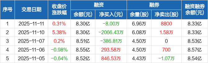 融资方面,当日融资买入4146.05万元,融资偿还4154.05万元,融资净偿还8万元,连续3日净偿还累计2461.24万元。融券方面,融券卖出9400股,融券偿还600股,融券余量6.96万股,融券余额296.58万元。融资融券余额合计8.33亿元。