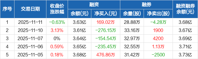 融资方面,当日融资买入1855.23万元,融资偿还1686.21万元,融资净买入169.02万元。融券方面,融券卖出2800股,融券偿还4.56万股,融券余量28.88万股,融券余额500.78万元。融资融券余额合计3.68亿元。