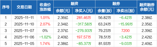 融资方面,当日融资买入1998.72万元,融资偿还1717.25万元,融资净买入281.46万元。融券方面,融券卖出1100股,融券偿还6.53万股,融券余量56.82万股,融券余额169.89万元。融资融券余额合计2.38亿元。