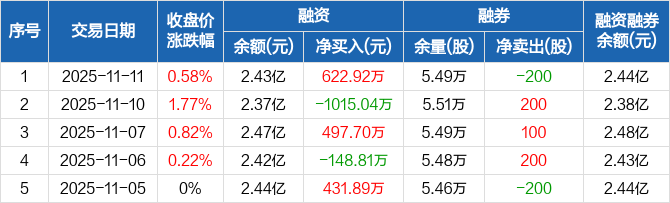 融资方面,当日融资买入1635.53万元,融资偿还1012.61万元,融资净买入622.92万元。融券方面,融券卖出0股,融券偿还200股,融券余量5.49万股,融券余额76.09万元。融资融券余额合计2.44亿元。