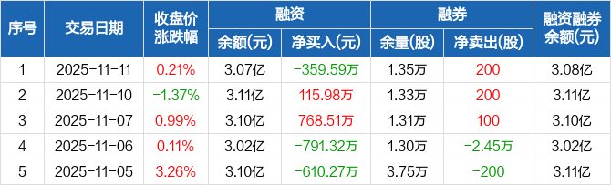 德赛电池融资融券信息显示,2025年11月11日融资净偿还359.59万元;融资余额3.07亿元,较前一日下降1.16%。