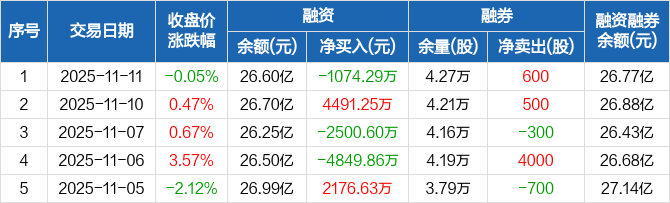 北方华创:融资净偿还1074.29万元,融资余额26.6亿元(11-11)
