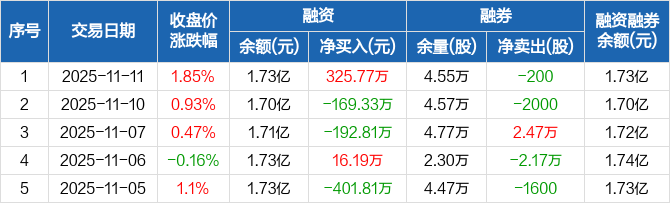 融资方面,当日融资买入1903.92万元,融资偿还1578.15万元,融资净买入325.77万元。融券方面,融券卖出0股,融券偿还200股,融券余量4.55万股,融券余额30.08万元。融资融券余额合计1.73亿元。