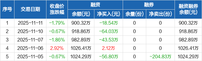 融资方面,当日融资买入169.37万元,融资偿还187.91万元,融资净偿还18.54万元,连续3日净偿还累计126.09万元。融券方面,融券卖出0份,融券偿还0份,融券余量0份,融券余额0元。融资融券余额合计900.32万元。
