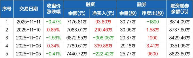 融资方面,当日融资买入812.61万元,融资偿还718.81万元,融资净买入93.8万元。融券方面,融券卖出400股,融券偿还2200股,融券余量30.77万股,融券余额1637.27万元。融资融券余额合计8814.09万元。