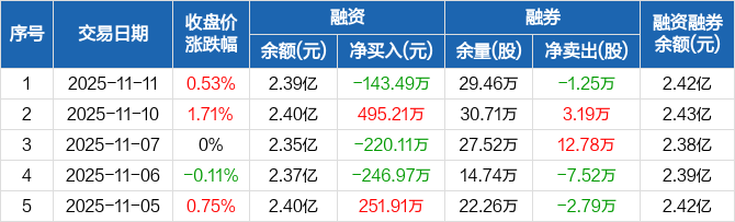 珠江啤酒:融资净偿还143.49万元,融资余额2.39亿元(11-11)