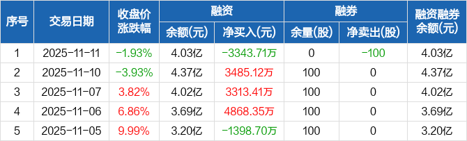 融资方面,当日融资买入9351.35万元,融资偿还1.27亿元,融资净偿还3343.71万元。融券方面,融券卖出0股,融券偿还100股,融券余量0股,融券余额0元。融资融券余额合计4.03亿元。