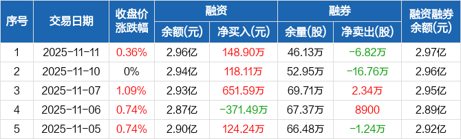 融资方面,当日融资买入1247.26万元,融资偿还1098.37万元,融资净买入148.9万元,连续3日净买入累计918.6万元。融券方面,融券卖出2900股,融券偿还7.11万股,融券余量46.13万股,融券余额128.24万元。融资融券余额合计2.97亿元。