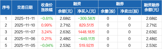 宇环数控融资融券信息显示,2025年11月11日融资净偿还309.58万元;融资余额2.68亿元,较前一日下降1.14%
