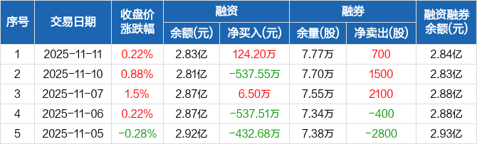 融资方面,当日融资买入1970.94万元,融资偿还1846.74万元,融资净买入124.2万元。融券方面,融券卖出2500股,融券偿还1800股,融券余量7.77万股,融券余额143.51万元。融资融券余额合计2.84亿元。