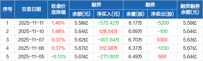 莱茵生物:融资净偿还575.42万元,融资余额5.58亿元(11-11)