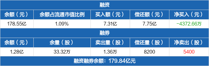 融资方面,当日融资买入7.31亿元,融资偿还7.75亿元,融资净偿还4372.66万元。融券方面,融券卖出1.36万股,融券偿还8200股,融券余量33.32万股,融券余额1.28亿元。融资融券余额合计179.84亿元。