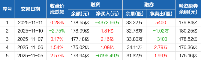 宁德时代融资融券信息显示,2025年11月11日融资净偿还4372.66万元;融资余额178.55亿元,较前一日下降0.24%