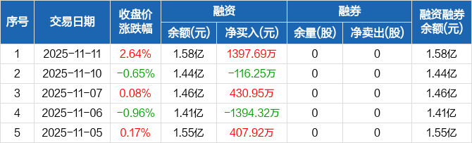 融资方面,当日融资买入4297.25万元,融资偿还2899.56万元,融资净买入1397.69万元。融券方面,融券卖出0股,融券偿还0股,融券余量0股,融券余额0元。融资融券余额合计1.58亿元。