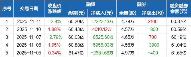 同花顺:融资净偿还2223.13万元,融资余额60.2亿元(11-11)