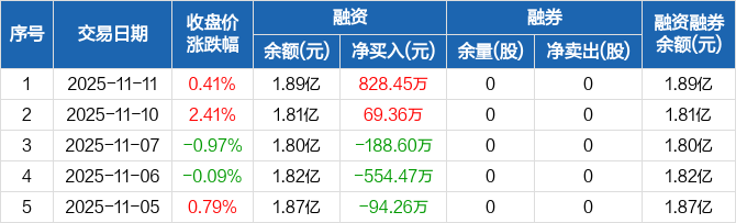 融资方面,当日融资买入2588.45万元,融资偿还1760万元,融资净买入828.45万元。融券方面,融券卖出0股,融券偿还0股,融券余量0股,融券余额0元。融资融券余额合计1.89亿元。