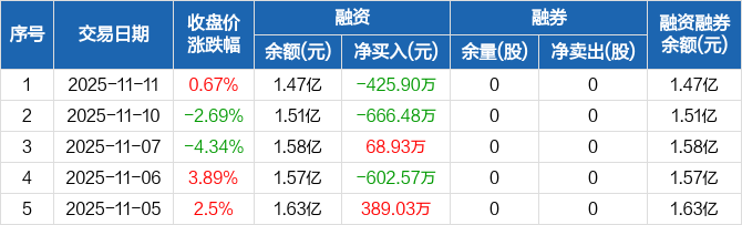 融资方面,当日融资买入714.18万元,融资偿还1140.08万元,融资净偿还425.9万元。融券方面,融券卖出0股,融券偿还0股,融券余量0股,融券余额0元。融资融券余额合计1.47亿元。