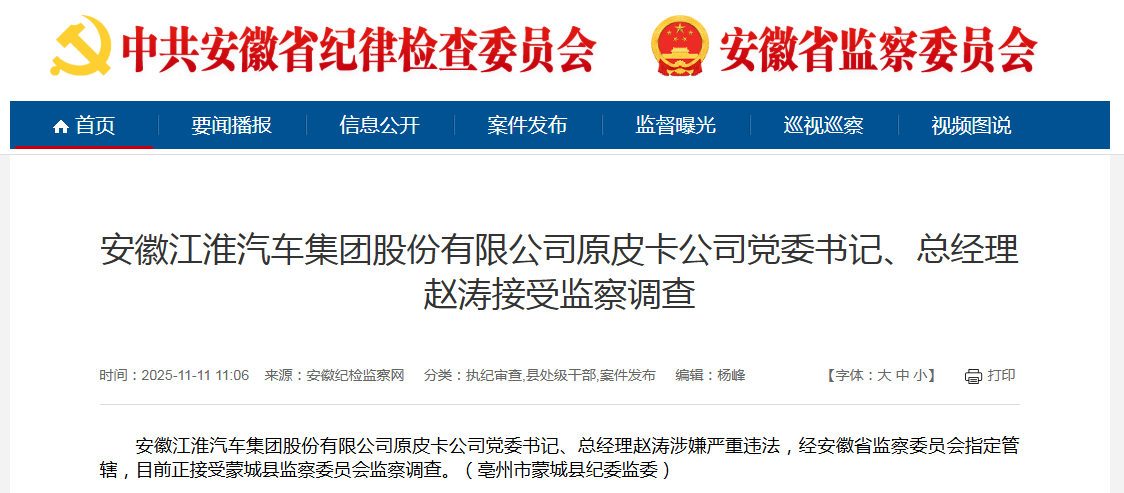 11月11日,据安徽纪检监察网通报,江淮汽车(600418)原皮卡公司党委书记、总经理赵涛因涉嫌严重违法,经安徽省监察委员会指定管辖,目前正接受安徽亳州市蒙城县监察委员会监察调查。