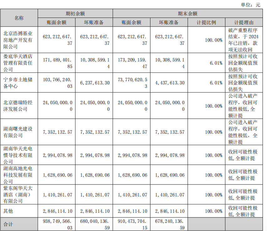 尽管流动资产不少,但华天酒店的其他应收款也难以收回。公司其他应收款账面价值2.8亿元,其实账面余额应该近10亿元,其中近7亿元均计入坏账准备无法收回。