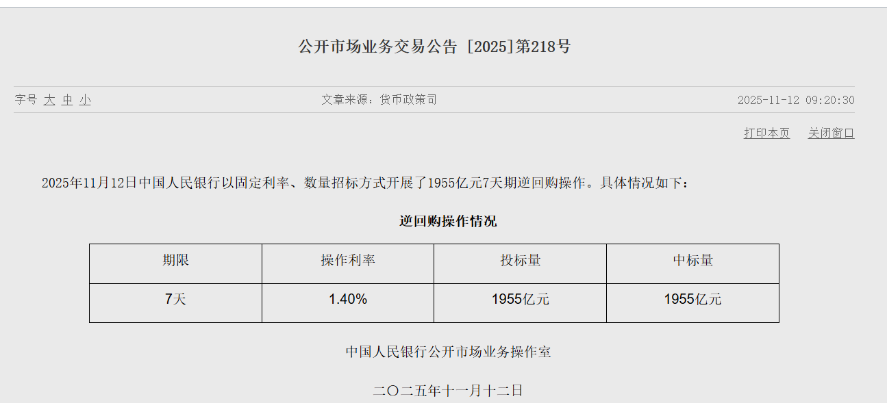 中国人民银行网站消息,11月12日,中国人民银行以固定利率、数量招标方式开展了1955亿元7天期逆回购操作,操作利率为1.40%,与此前持平。因今日有655亿元7天期逆回购到期,当日实现净投放1300亿元。