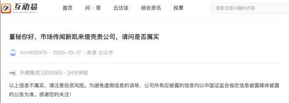 上证报中国证券网讯(记者杨子晏)11月12日,记者在互动易平台看到,有投资者提问天健集团:“市场传闻新凯来借壳贵公司,请问是否属实?”对此,天健集团回复称:“信息不属实,请注意投资风险。”