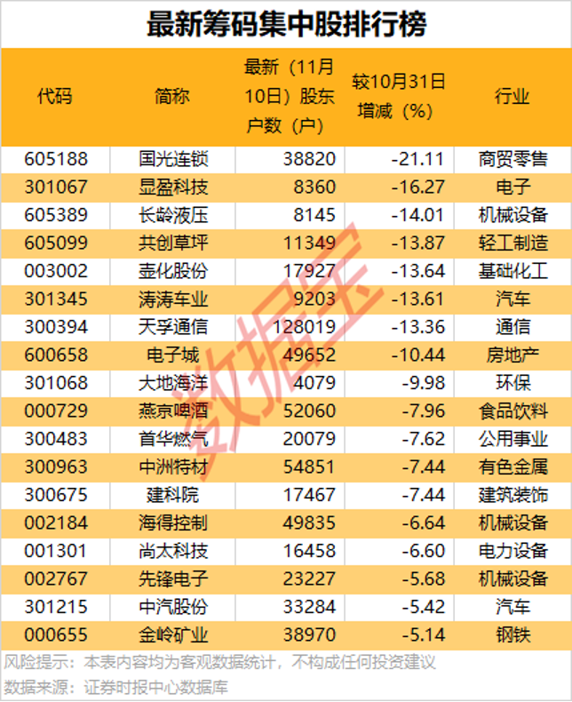股东户数降幅最多的是国光连锁,截至11月10日最新股东户数为38820户,较10月31日下降21.11%;其次是显盈科技,截至11月10日最新股东户数为8360户,较10月31日下降16.27%。
