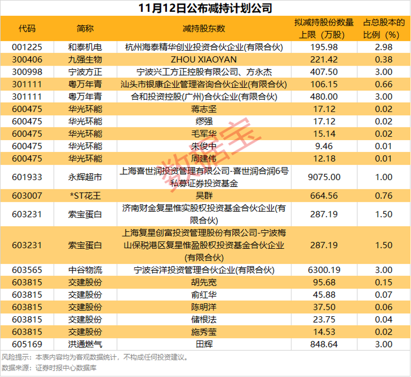 11月12日,11家公司发布了减持计划。粤万年青、宁波方正等拟减持比例居前。