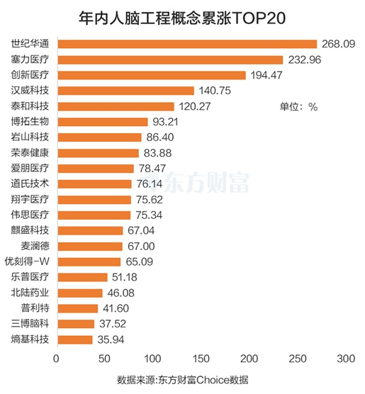 事实上,年内人脑工程板块持续强势,截至11月12日早盘结束,累计涨幅达50.06%。个股而言,世纪华通成为人脑工程板块涨幅最大个股,截至11月12日早盘结束,年内大涨268.09%。塞力医疗紧随其后,年内大涨232.96%。创新医疗、汉威科技、泰和科技年内也翻倍,涨幅分别为194.47%、140.75%和120.27%。
