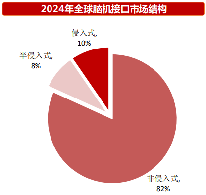 资料显示,脑机接口的形式主要有侵入式、半侵入式(介入式)和非侵入式三种。其中非侵入式在目前市场中占主导地位。根据Precedence Research的数据,2024年全球脑机接口市场中,非侵入式产品以其82%的绝对市场占有率彰显了其当前的主导地位。