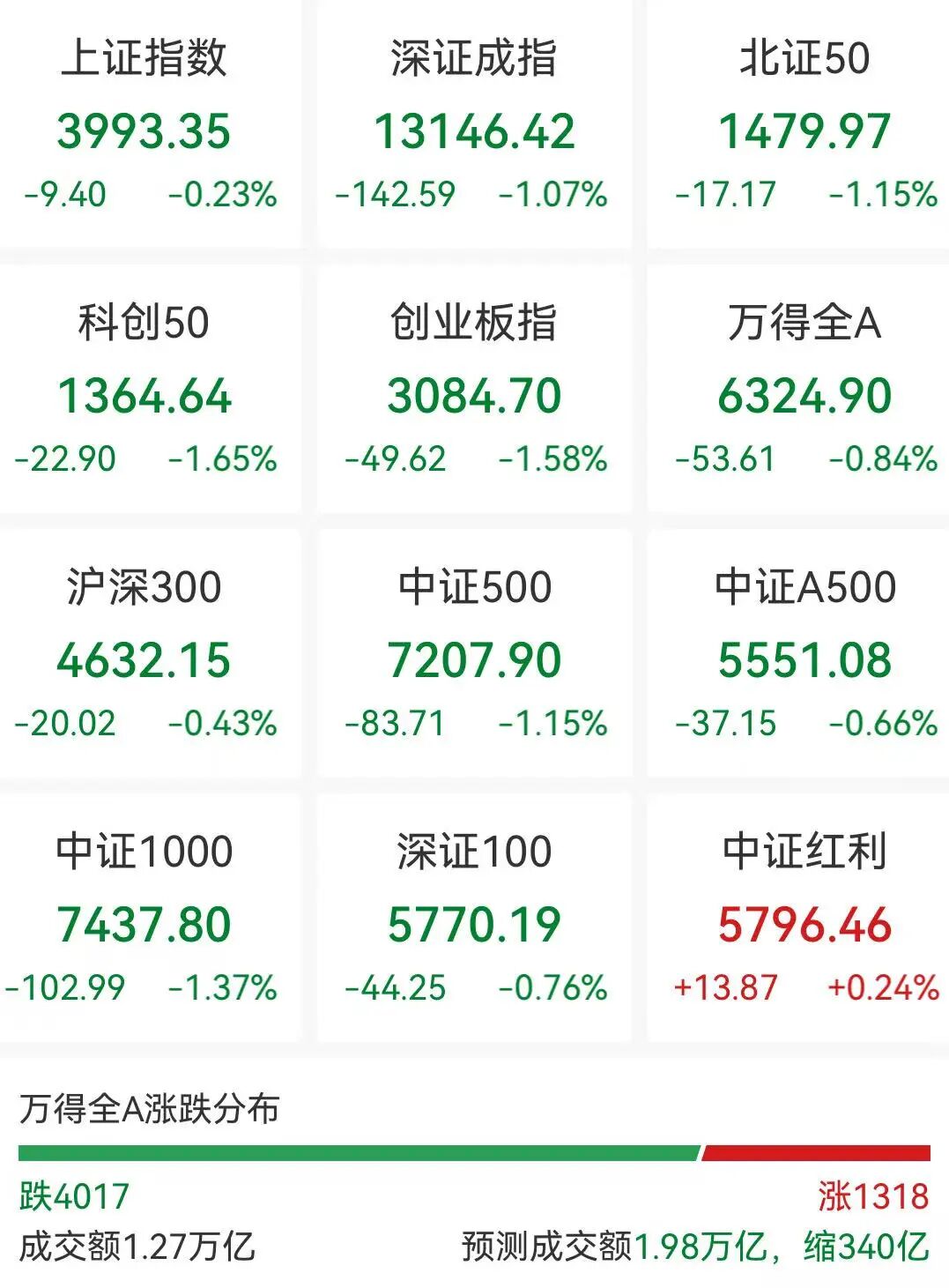 11月12日,A股市场早盘震荡走弱,三大指数翻红后再度回落,截至午间收盘,沪指跌0.23%,深成指跌1.07%,创业板指跌1.58%。市场半日成交额1.27万亿,超4000只个股下跌。