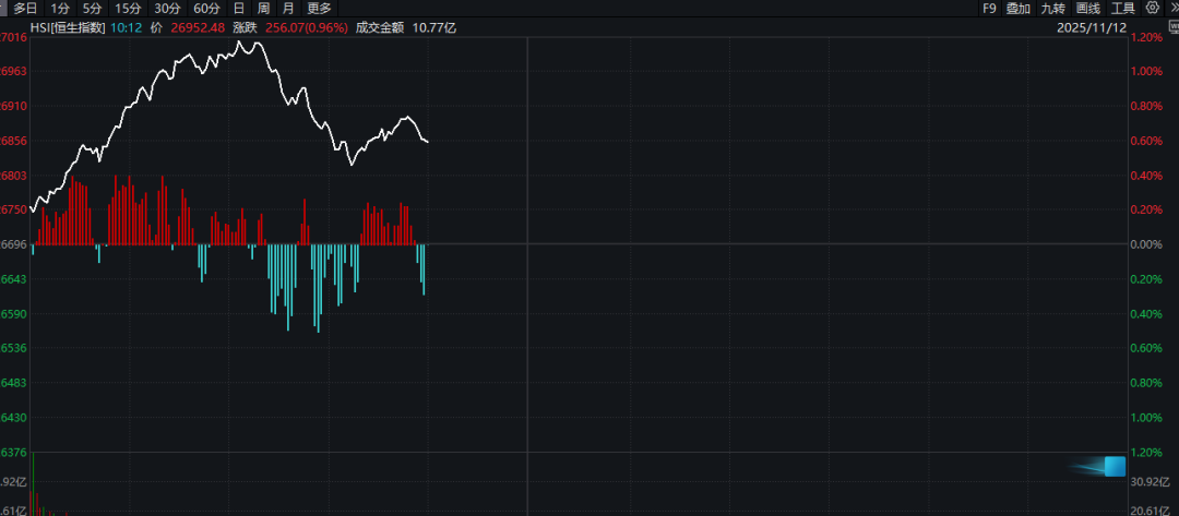 港股市场今天上午整体走强,恒生指数盘中一度突破27000点关口。