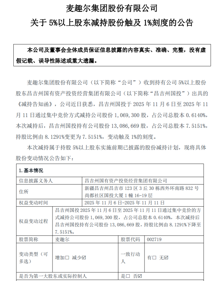 麦趣尔发布的公告显示,其持股5%以上股东昌吉州国投于2025年11月6日至2025年11月11日期间,通过深圳证券交易所集中竞价交易系统累计减持麦趣尔股份106.93万股,占公司总股本的0.614%。本次减持完成后,昌吉州国投仍持有麦趣尔股份1308.6669万股,持股比例由减持前的8.1291%降至7.5151%。