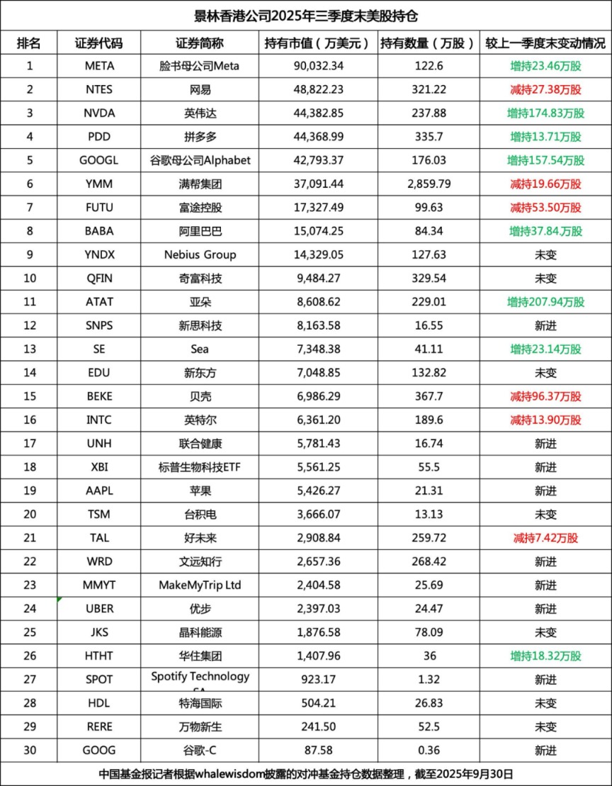【导读】景林香港公司2025年三季度末美股持仓曝光
