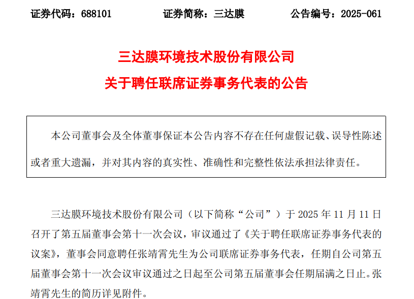 11月11日晚间,三达膜(688101)发布公告称,董事会同意聘任张靖霄为公司联席证券事务代表。