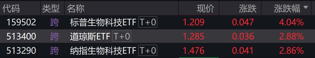 此外,标普生物科技ETF涨超4%,纳指生物科技ETF涨超2%。