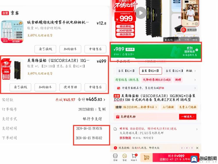 济南市民张先生向记者展示了他的购买记录,2024年6月3日购买的内存条凑单到手价为460余元,而11月10日,同品牌同规格的内存条“双十一”价格为989元。