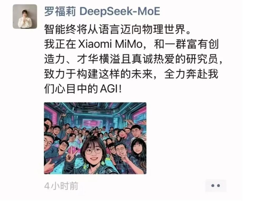 她在朋友圈表示,“智能终将从语言迈向物理世界。我正在Xiaomi MiMo,和一群富有创造力、才华横溢且真诚热爱的研究员,致力于构建这样的未来,全力奔赴我们心目中的AGI。”