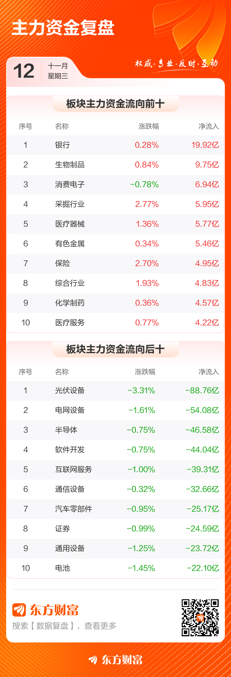 11月12日,沪指跌0.07%,深成指跌0.36%,创业板指跌0.39%。两市成交额1.95万亿,较上个交易日缩量486亿。数据显示,今日大盘主力资金净流出671.89亿。银行、生物制品、消费电子等板块主力资金流入排名居前,其中银行净流入19.92亿元。